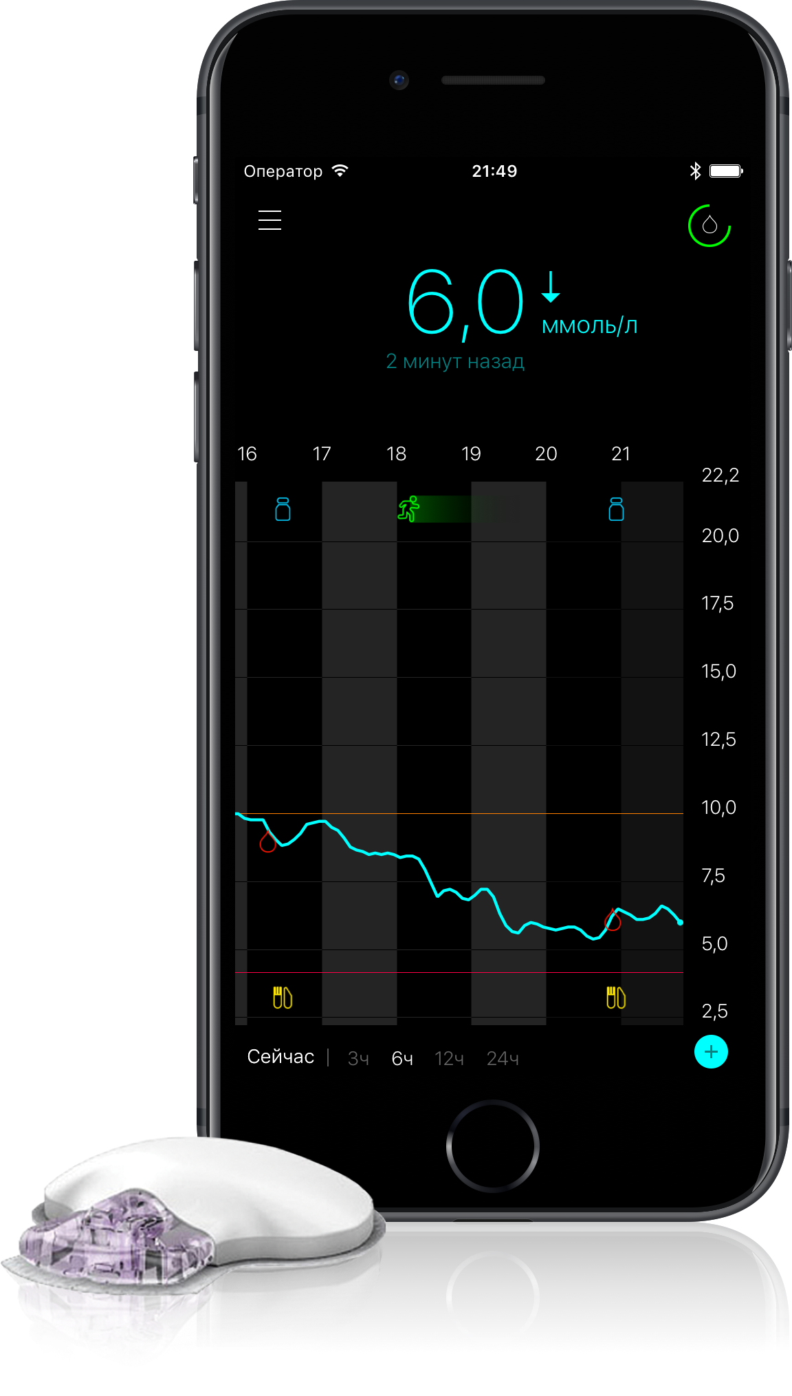 НМГ - это система, позволяющая отслеживать уровень сахара крови в режиме реального времени. Стандартная система НМГ состоит из: сенсора, передатчика и ридера/смартфона/умных часов и т.п. Таким образом, вы можете узнать уровень сахара крови моментально и без проколов: просто приложив ридер к сенсору или посмотрев на экран телефона.