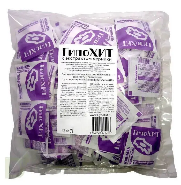 - Таблетки для купирования гипогликемии ГипоХит содержат экстракт плодов черники. Это очень полезно для глаз и придает конфеткам приятный ягодный вкус.