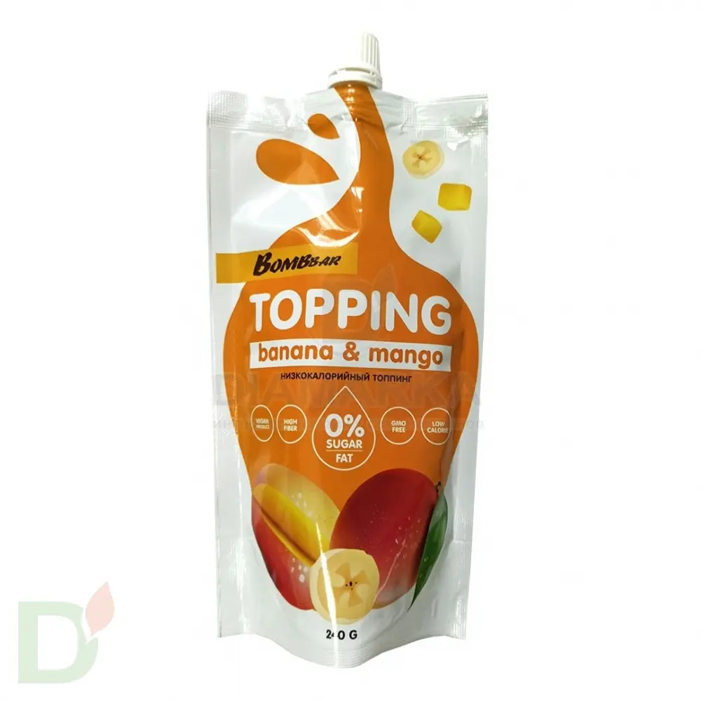 <h2>8 калорий, 0 жиров, минимум углеводов</h2> Об этом можно было только мечтать. Представьте: в ваших силах сделать привычные (возможно даже чуть поднадоевшие) блюда еще вкуснее и ярче! При этом их калорийность практически не изменится.<br> <h2>Топпинг без сахара, химии и ГМО</h2> Идеально для тех, кто долго и придирчиво выбирает продукты по составу. В составе топпингов Бомббар вы не найдете никакого криминала. Низкий гликемический индекс, минимум ккал и углеводов точно убедят вас попробовать эту вкуснятину!<br> <br> <b>Подходит для беременных и кормящих, людей с диабетом, спортсменов и тех, кто на диете.</b><br> <h2>Куда добавлять топпинг</h2> Вариаций использования топпингов масса. Вот лишь некоторые из них:<br> <ul> <li>в кашу, творог, йогурт</li> <li> как вкусовая добавка к мороженому</li> <li> составляющая для сладких тостов</li> <li> к фруктовому салату</li> <li> в качестве пропитки для домашнего торта</li> <li> к блинчикам, оладьям, сырникам</li> <li> в напитки и коктейли</li> <li> как украшение для домашних десертов</li> </ul> <h2>Состав топпинга банан-манго</h2> вода, яблочное пюре, изомальтоолигосахарид, банан, манго, загустители (ксантановая камедь, гуаровая камедь), натуральный краситель (турмерик), ароматизаторы натуральные, регулятор кислотности (лимонная кислота), антиокислитель (аскорбиновая кислота), консерванты (сорбат калия, бензоат натрия), подсластитель (сукралоза).<br> <h2>КБЖУ на порцию 15 грамм</h2> белки - 0<br> жиры - 0<br> углеводы - 0,7<br> пищевое волокно - 2,2<br> ккал - 8<br> <br> <b>Срок годности топпинга - 6 месяцев с даты изготовления</b>